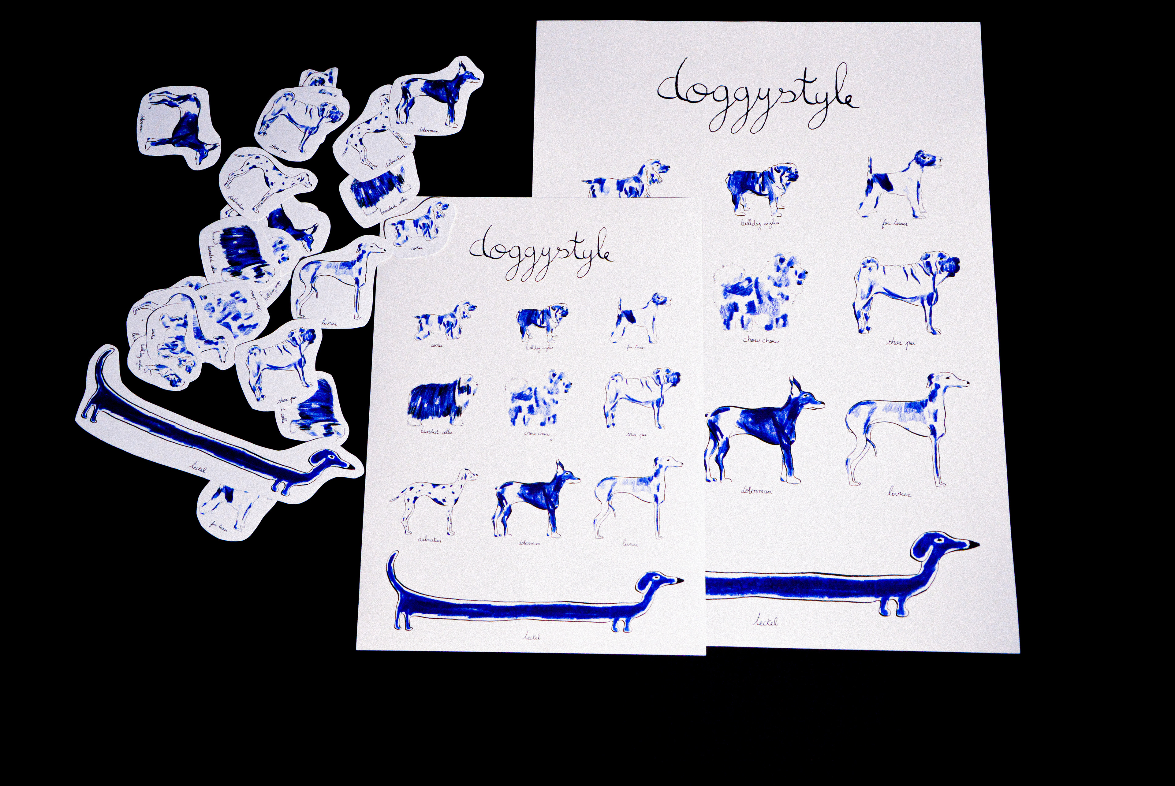 Illustrations de chiens au crayon de couleur, plume et encre de chine. Affiches A4 et A3 ainsi que des stickers qui les accompagnent.