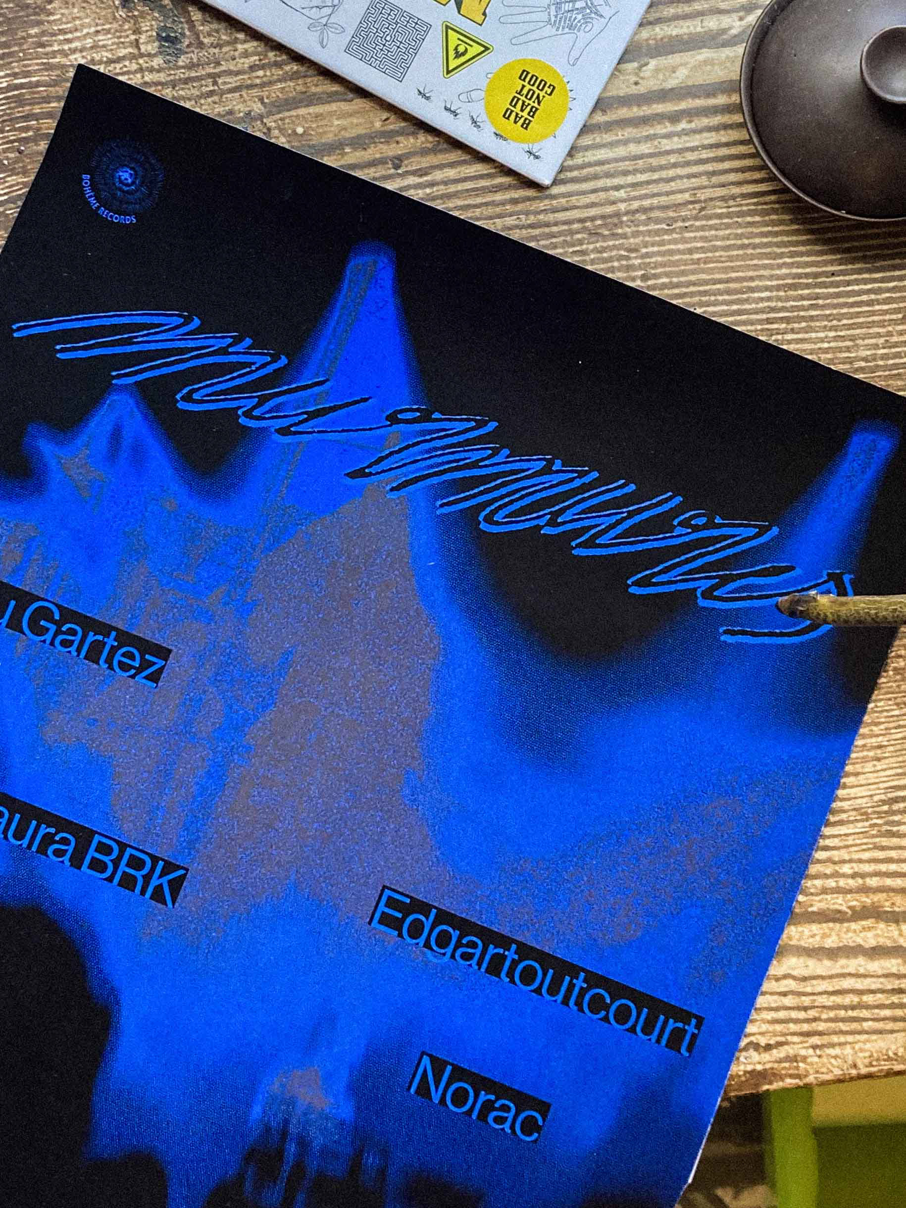 Les tonalités bleues/grises et le choix visuel sont issus d'une photographie argentique personnelle que j'ai déconstruite et modifiée à travers de multiples superpositions et retouches photographiques. Ce visuel renvoie une ambiance mystérieuse et nébuleuse en accord avec le genre musical.